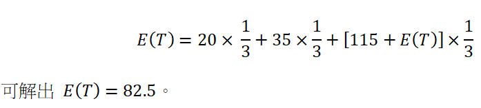 若選擇 Z 走廊,將會花 115 分鐘後回到原點。假設從原點開始出發,離開的期望時間為E(T),則 E(T|Z) = 115 + E(T),表示浪費 115 分鐘後回到原點,而從原點出發,無論之前的狀況如何,接下來的預期時間為 E(T),因為你無法分辨哪一個走廊是否走過。因此 E(T) 是三種情況的加權平均,選擇各走廊的機率皆為 1/3,故由