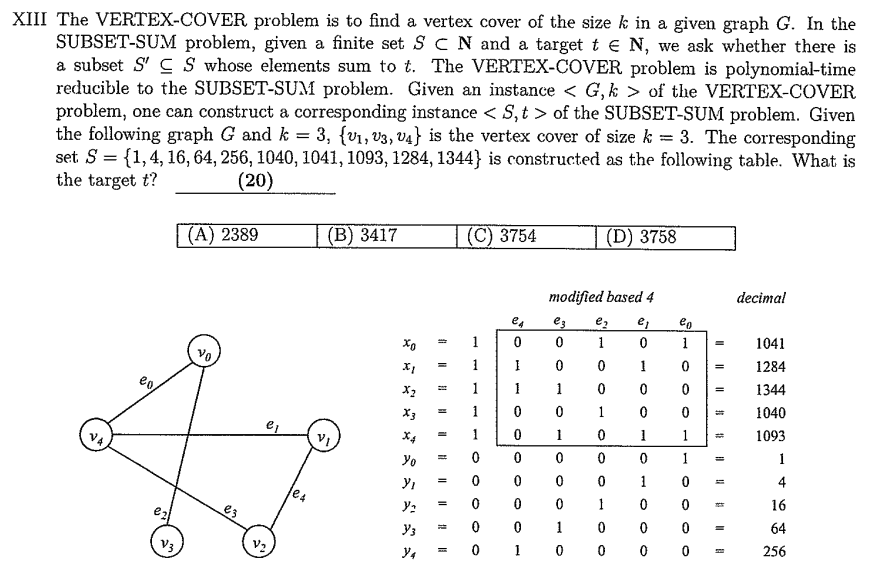 尋找對應子集合根據前面計算的base-4編碼換算成十進制,可得整個集合:S={1,4,16,64,256,1040,1041,1093,1284,1344}。而目標值 t=3754,代表我們要在集合 S 當中找到總和為3754的子集合。我們先找出三個頂點 v1,v3 和 v4 ,他們可以覆蓋所有的邊,為其中一組可行的 k=3 的 vertex cover,對應的變數 x1,x3 和 x4,將他們的base-4編碼加總為:1284+1040+1093=3417。接著觀察哪些邊僅被覆蓋一次,我們需要補上對應的補償變數,例如 e0 僅由 v4 覆蓋,因此需要補上補償變數 y0。而 e1 同時由 v1 和 v4 覆蓋,因此就不需要補上對應的補償變數 y1。最後需要補上的補償變數為 y0,y2,y3,y4,將他們的base-4編碼加總為:1+16+64+256=337。將此數值與前面的總和3417加總,可得3754,與目標值 t 相等。因為找到子集合的總和符合目標值,代表 subset sum 問題有解,同時也代表對應的 vertex cover 問題有解,其對應的 vertex cover 為 {v1,v3,v4}。