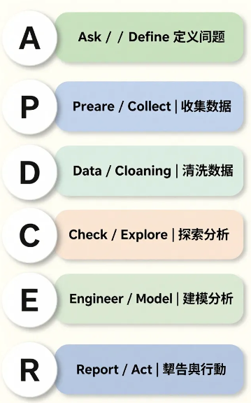實務上,數據分析可以分為六個核心步驟,我們簡稱A-P-D-C-E-R◦