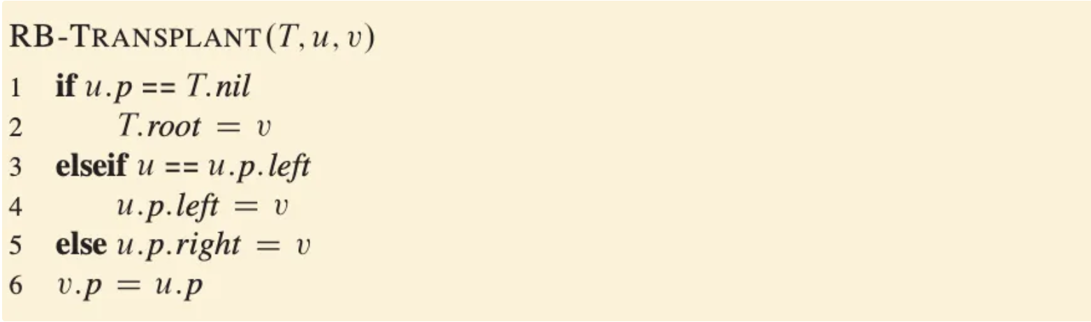 操作介紹:transplant在刪除的操作裡,我們會需要知道被刪除的點該如何從原本的樹裡面被拿出來,以及他原本的parent跟children該如何處理。因此會有兩個主角,分別是節點u和節點v,原則就是將節點u的parent跟children妥善安排到節點v上面,就可以安心將節點u刪除了。首先我們先來看在原文書裡如何定義transplant這項操作: