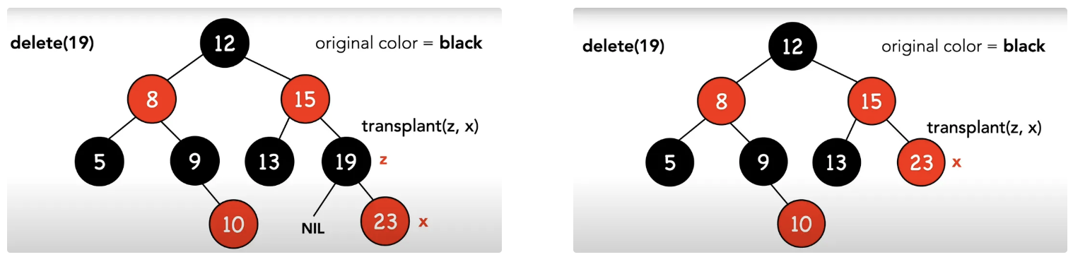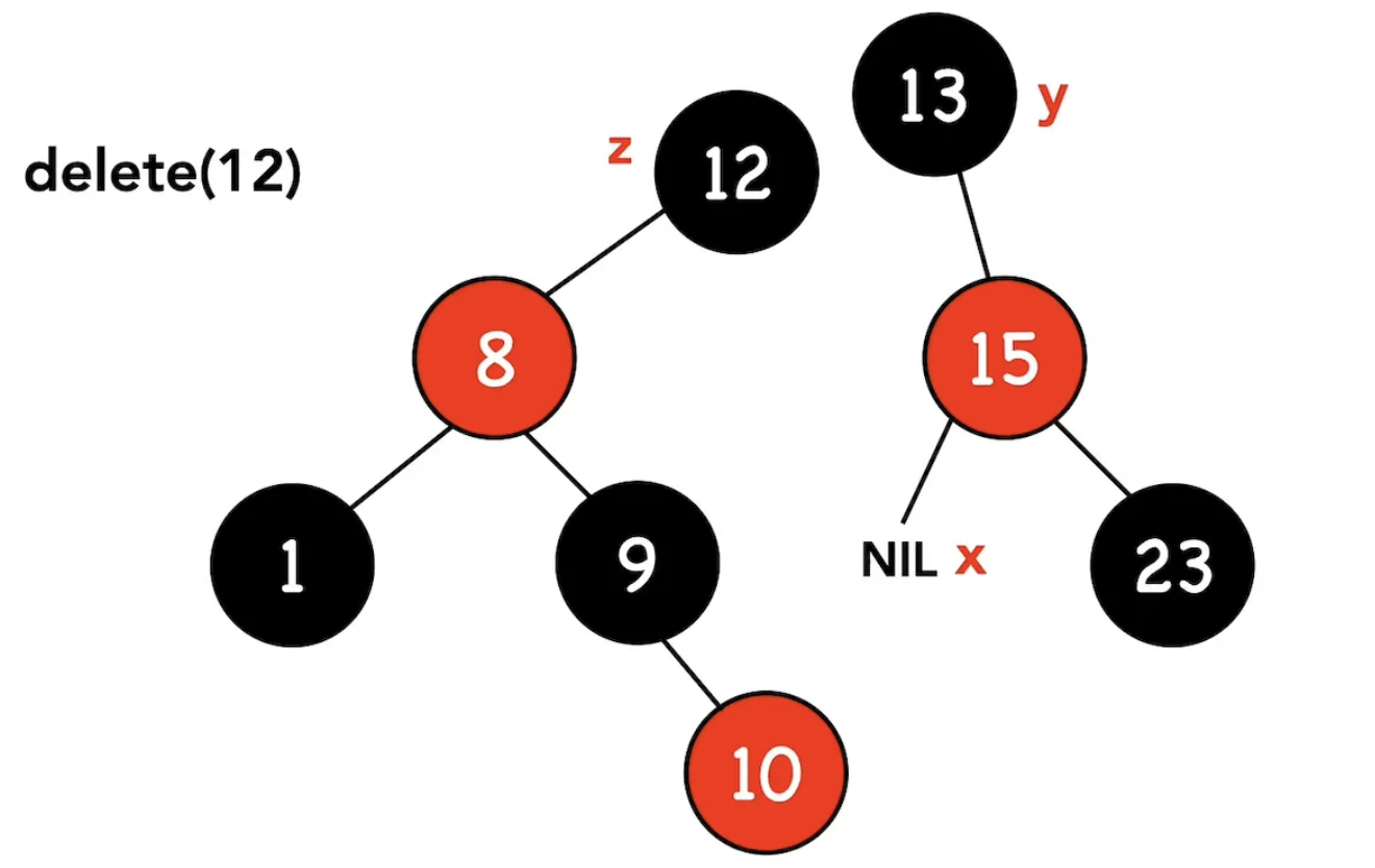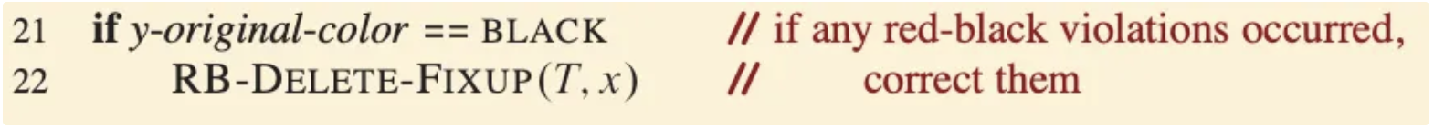 講解到這裡並配合說明圖片去看,相信有不少讀者已經發現,這樣的操作不就是二元搜尋樹在進行刪除時的操作嗎!那為什麼要講得那麼複雜?原因是因為,在紅黑樹的刪除裡,存在delete_fixup這項維持紅黑樹特性的操作,而在進行這項操作時會需要參考節點y的顏色作為依據。因此除了原本的刪除流程以外,我們會需要去追蹤節點y的顏色,以判斷是否需要做最後的調整!
