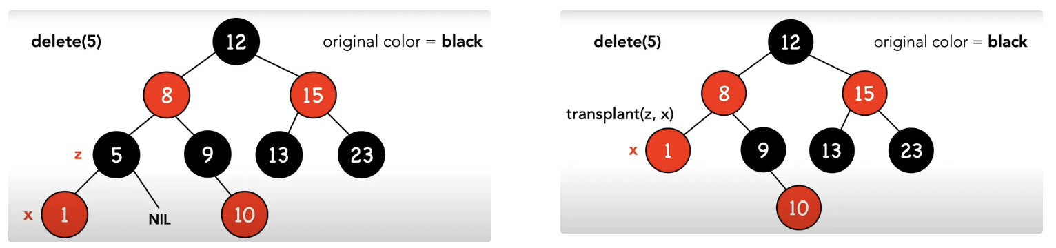 - 呼叫transplant(z, z.left),用節點z的左側節點來取代節點z: