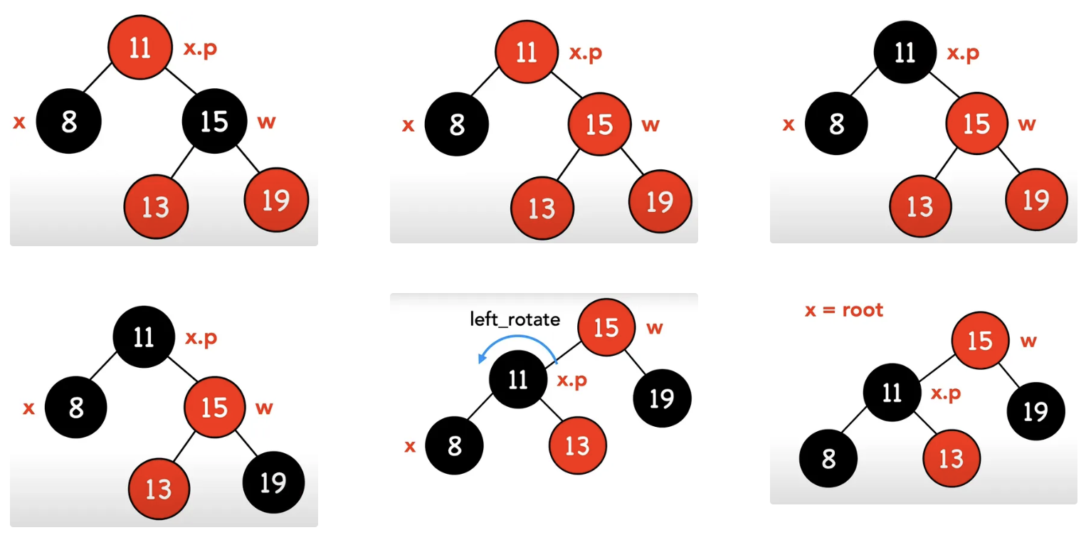 規則很簡單,如果y-originall-color是黑色,就對節點x進行在delete_fixup這項操作。以下操作中的節點x,代表著高度出問題的節點,而節點w代表節點x的sibling,兩者關係為節點x是左側節點,分為四種狀況: