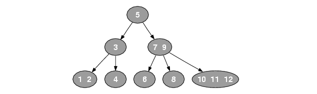 我們在之前的文章裡有稍微提及,紅黑樹是2-3-4樹的二元搜尋樹版本。2-3-4樹是B-tree的一種,數字的2-3-4代表每個節點可以是2-節點、3-節點或是4-節點,數字對應的是該節點有多少個子節點。作為B-tree的一員,紅黑樹需要遵守一項重要原則:「所有葉節點位於同一層」,以此維持高度在O(logn)這個等級。下圖為2-3-4樹的示意圖,其中只有一個key值的節點為2-節點(例如根節點),而左下包含兩個key值(1,2)的節點為3-節點,右下包含三個key值(10,11,12)的節點為4-節點。