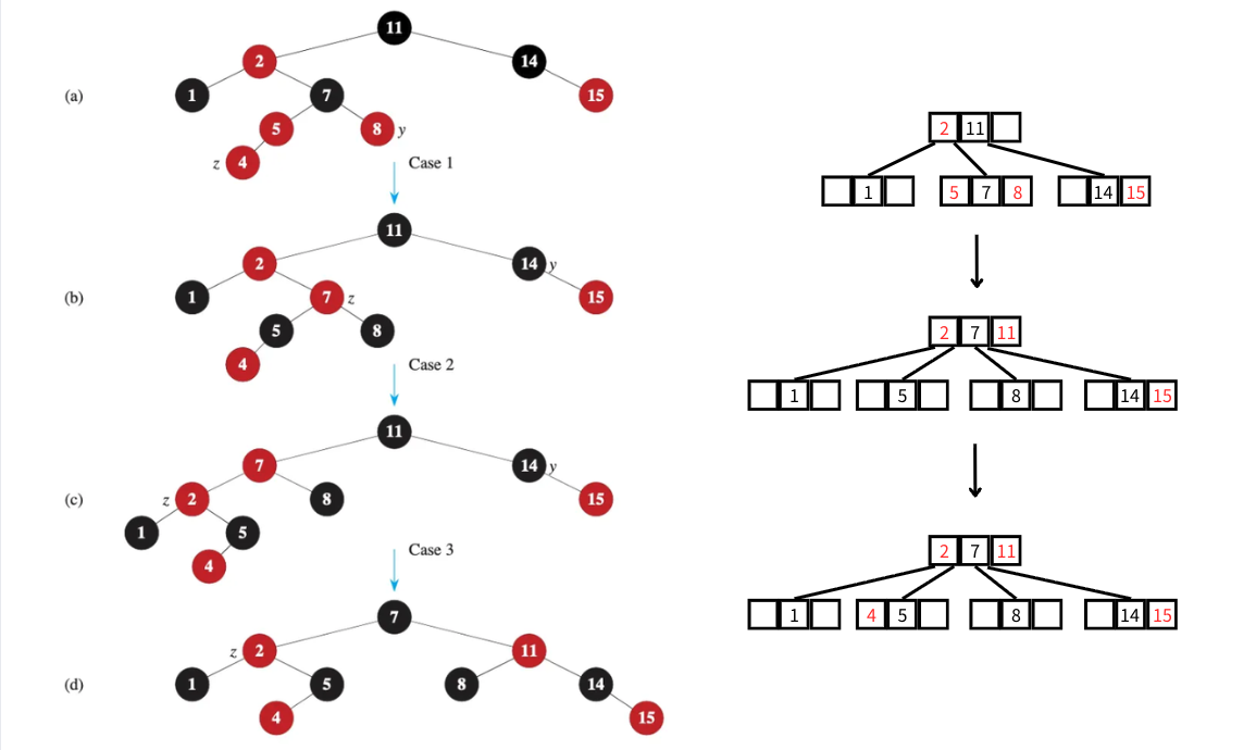 至於要如何轉換呢?首先,按照定義,把黑色節點跟子節點當中的紅色節點進行合併,例如11的子節點當中,2是紅色,因此在2-3-4樹當中,11跟2就屬於同一個節點。轉換完成後,就按照2-3-4樹的插入步驟來插入4這個key值。2-3-4樹的插入步驟很簡單,在插入的過程裡遇到的4-節點,轉換為2-節點即可(split)。例如在插入過程裡,包含5,7,8這三個key值的節點為4-節點,因此需要進行split操作,將中間的key值交給上面的節點,而剩下的key值分裂為左右兩個節點,形成兩個2-節點。再來,將要插入的key值4放到對應位置後,2-3-4樹的插入便處理完成了。最後,只需要用相同的技巧,將2-3-4樹還原回紅黑樹,就可以得到與直接用紅黑樹操作相同的結果啦!