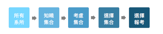 舉例來說:對想要念MBA的同學⽽⾔,對全台灣所有MBA系所的認知將會 構成同學的知曉集合,其中有些學校進入了同學起初的篩選標準⽽進入了考慮集合,之後隨著獲得資訊越來越多,篩選後的系所便構成了選擇集合,最後在這些集合中進⾏報考決策。 那麼,同學在進⾏考慮集合篩選的時候,建議第⼀標準就是──「這間研究所推上了我⼀定會去念!」,請同學務必選擇成功推上就會去念的系所,如果當初推上了⼀間⾃⼰很有把握、但並非⾃⼰所愛的學校,在甄試放榜後通常都會想要再嘗試考試入學,但因為⾃⼰本⾝已有⼀間學校的入學資格,對於⼤部分⼈來說將會降低⾃⾝的危機意識及動機,抱著「考考看說不定會考更好,沒考好也沒關係反正已經有學校」的僥倖⼼態。 再來,選擇完欲報考的研究所後就是──審查甄試資格,近年來可以看到各研究所的資格⾨檻有稍微放寬,例如台⼤國企所的報名資格是必須在系排名前50%,但是簡章上寫的報名資格與實際上錄取的標準卻未必是相同的,對於同學們想要申請的所別,還是要多向已在其中就讀的學長姐們打聽⼀下該所別偏愛的 學⽣成績⼤概必須在哪種標準以上。